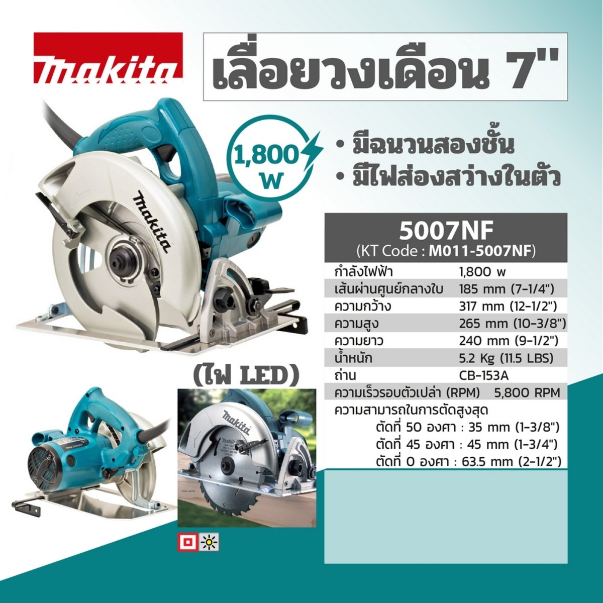 MAKITA 5007NF เลื่อยวงเดือน ขนาด 7 นิ้ว (185 มม.) กำลังไฟ 1,800 วัตต์ ความเร็วรอบ 5,800 รอบ/นาที มีไฟ LED